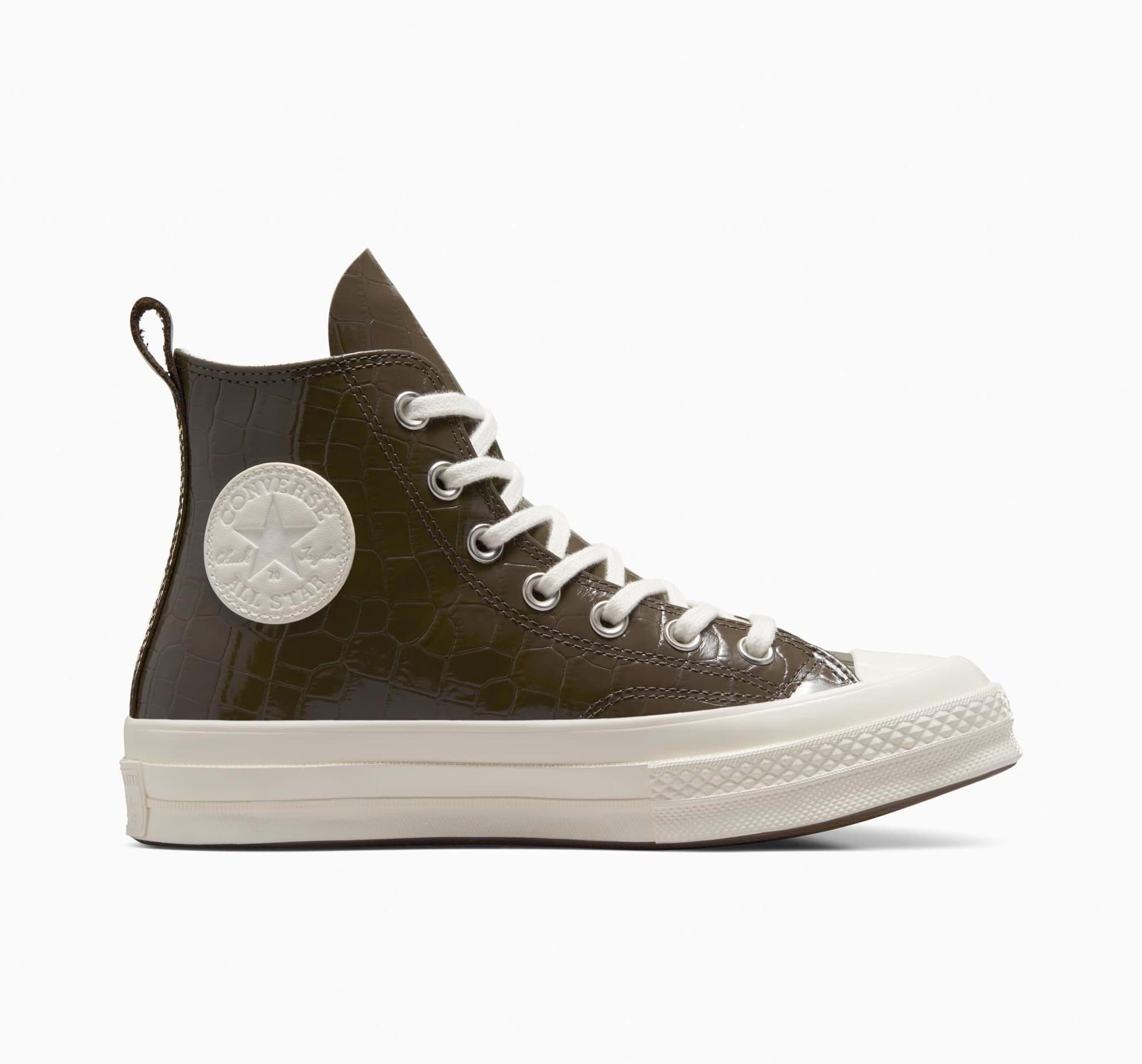 Modelul premium Chuck 70 face o plimbare pe partea sălbatică cu un model din piele de crocodil și piele lucioasă, pentru un farmec total. În plus, culorile neutre și detaliile tonale fac din acest model o piesă de bază ușor de aranjat.