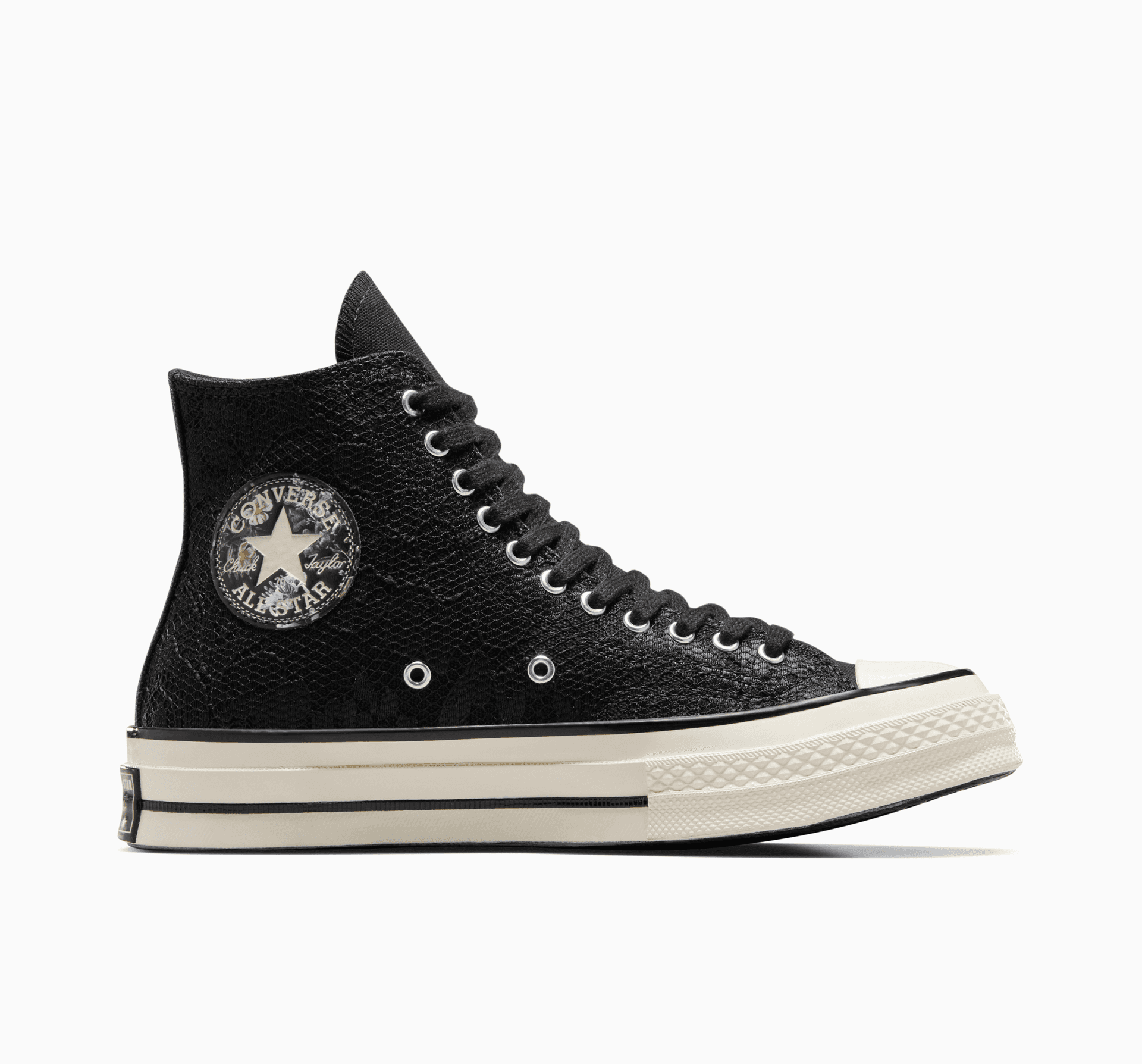 Exploatează-ți latura misterioasă cu high-tops, care se joacă de-a timiditatea. Dantela întunecată aduce îndrăzneala; floralele păstrează lucrurile delicate. Detaliile Premium Chuck 70 rămân, doar cu puțină dramă în plus.