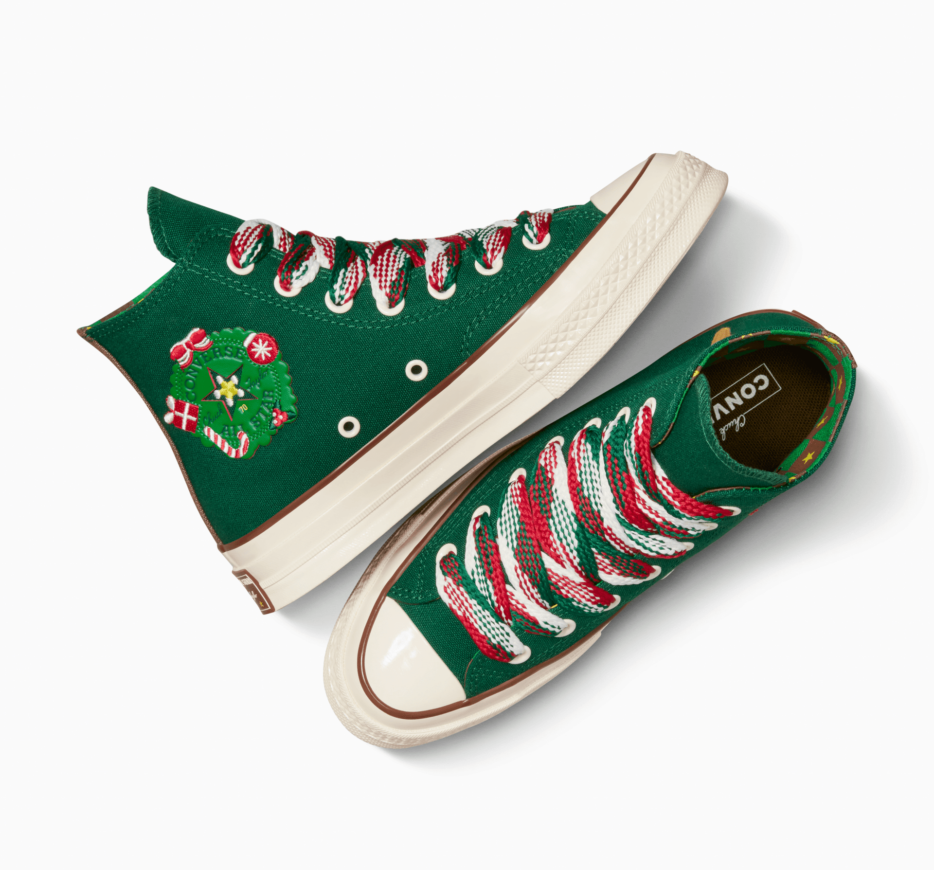 Cel mai bun cadou pe care-l poți oferi garderobei tale de Crăciun? Acest Chuck 70. Este îmbrăcat în roșu și verde pentru a aduce un fler festiv la fiecare pas. Este sezonul tricoturilor, așa că ajutoarele noastre magice de la atelierul Converse au introdus un ciorap detașabil din tricot pentru a vă ajuta să transformați orice „ținută” într-o minune de iarnă. Ce ar fi Crăciunul fără dulciuri? Preferatul tuturor, omul de turtă dulce, se alătură petrecerii și, pentru că anul acesta, tu (și garderoba ta) ați fost atât de drăguți, el este prezent de două ori — într-o versiune de tricot detașabilă și ca grafic pe lateral. Cadoul acestui Chuck 70 vesel? Primești două perechi de șireturi, astfel încât să-i poți decora în cel mai vesel mod.