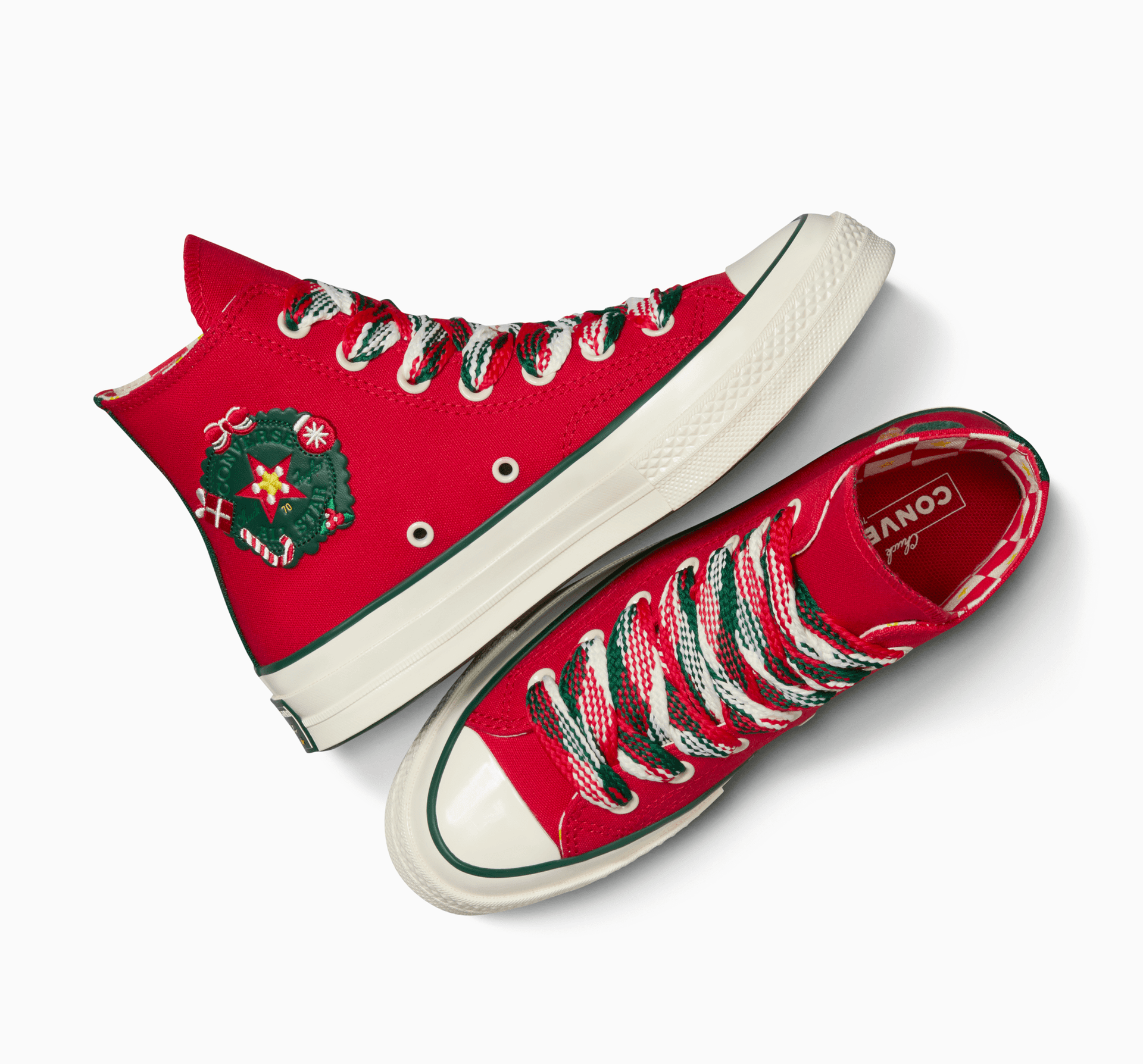Cel mai bun cadou pe care-l poți oferi garderobei tale de Crăciun? Acest Chuck 70. Este îmbrăcat în roșu și verde pentru a aduce un fler festiv la fiecare pas. Este sezonul tricoturilor, așa că ajutoarele noastre magice de la atelierul Converse au introdus un ciorap detașabil din tricot pentru a vă ajuta să transformați orice „ținută” într-o minune de iarnă. Ce ar fi Crăciunul fără dulciuri? Preferatul tuturor, omul de turtă dulce, se alătură petrecerii și, pentru că anul acesta, tu (și garderoba ta) ați fost atât de drăguți, el este prezent de două ori — într-o versiune de tricot detașabilă și ca grafic pe lateral. Cadoul acestui Chuck 70 vesel? Primești două perechi de șireturi, astfel încât să-i poți decora în cel mai vesel mod.