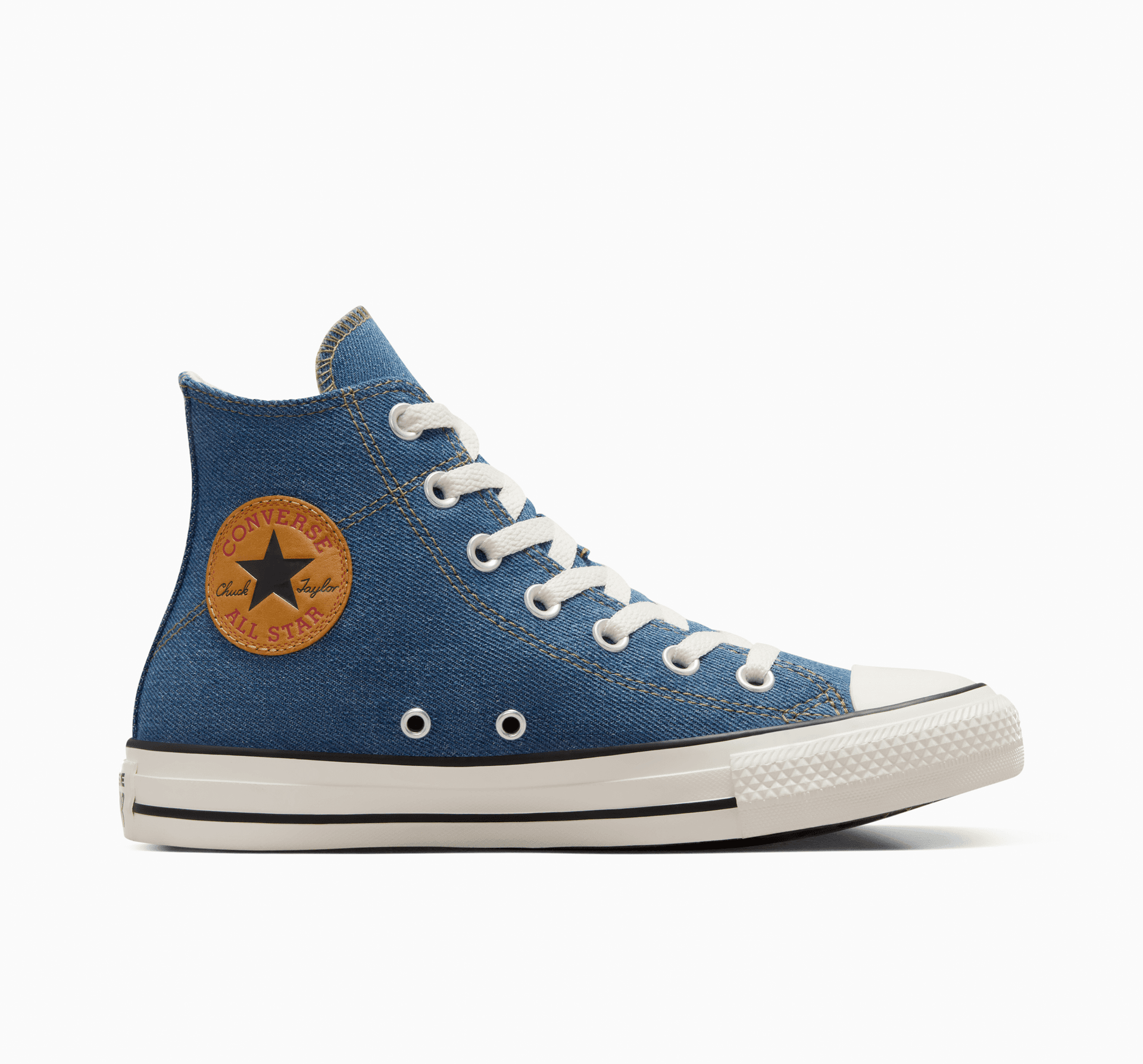- Un patch din piele Chuck Taylor face referire la eticheta preferată de blugi a ta