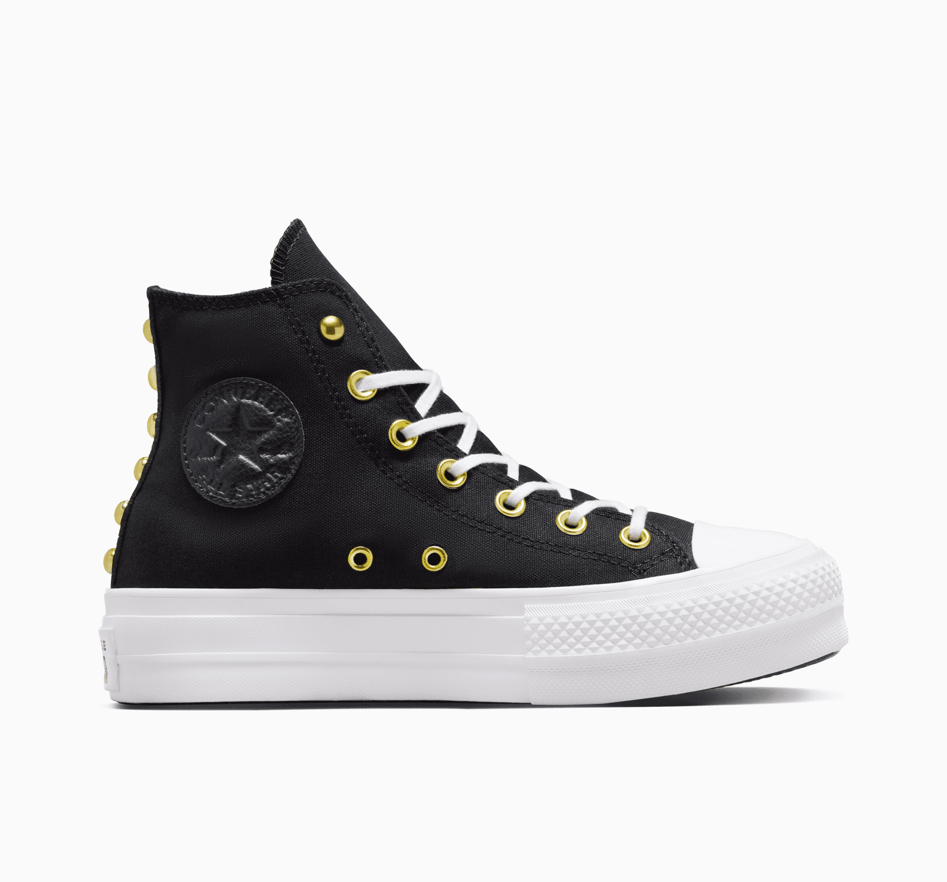 Du-ți aspectul la nivelul următor cu o nouă pereche de Chucks cu platformă. O parte superioară clasică din pânză și pielea artificială sunt decorate cu note aurii pentru o notă de eleganță, pe care o poți îmbrăca ușor, după cum dorești.