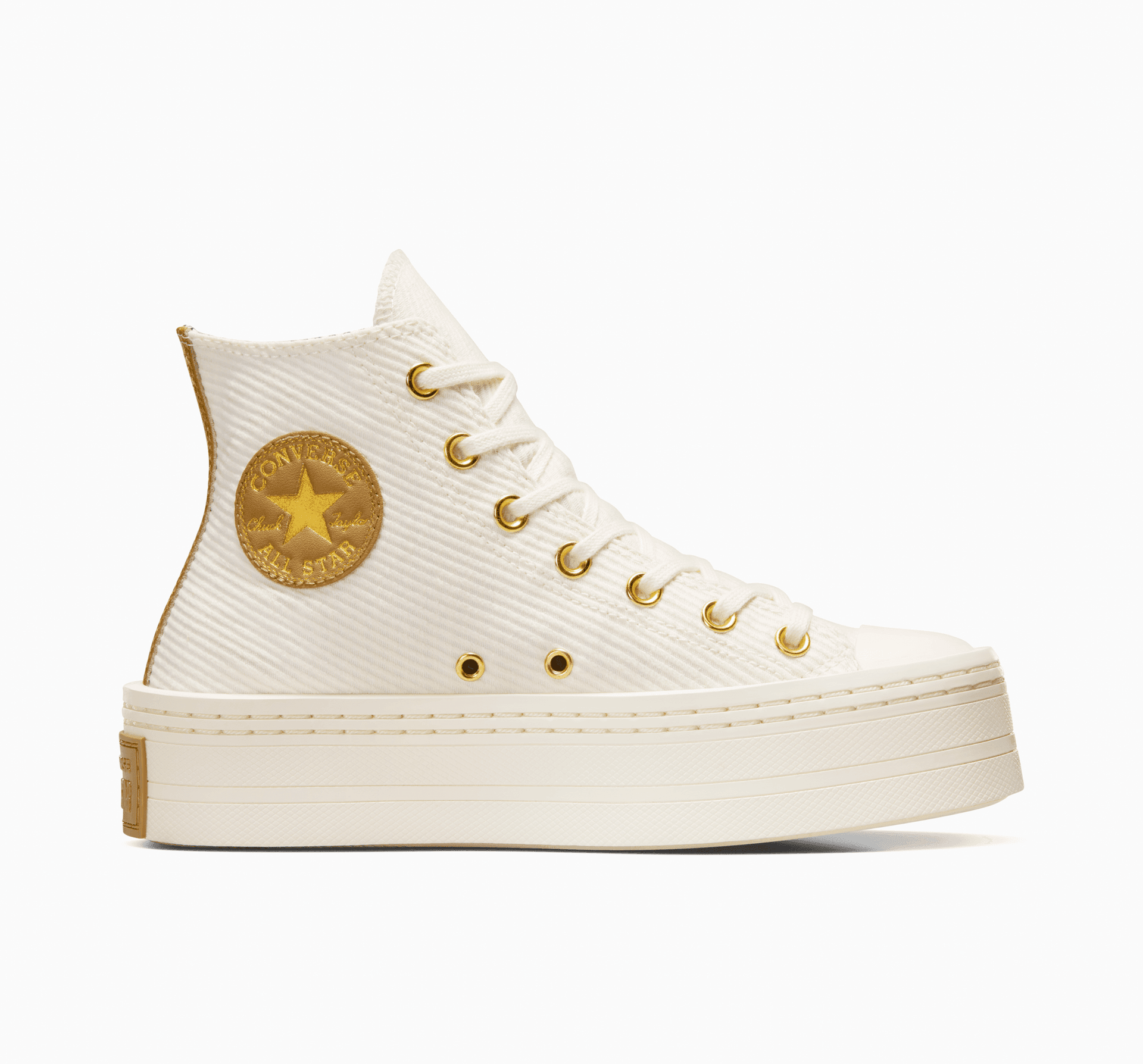 Aceste platforme se inspiră din calea ferată și din pistă. Catifeaua și cusăturile întărite le fac suficient de rezistente pentru activitatea ta zilnică. Și detaliile aurii adaugă o doză de lux pentru a completa o talpă intermediară înălțată.