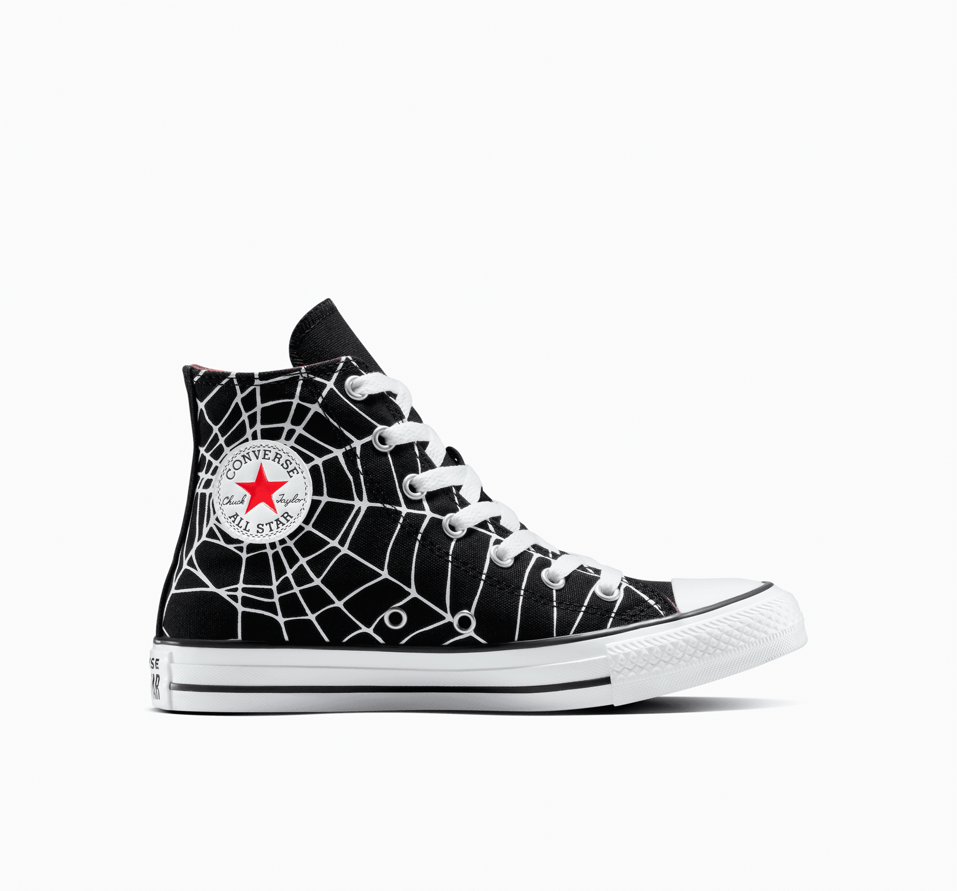 Sărituri, târâturi, țesuturi, învârtiri — pentru cei care parcă au opt picioare, aceste Chucks cu pânză de păianjen sunt locul perfect unde să-și așeze cei doi pași.