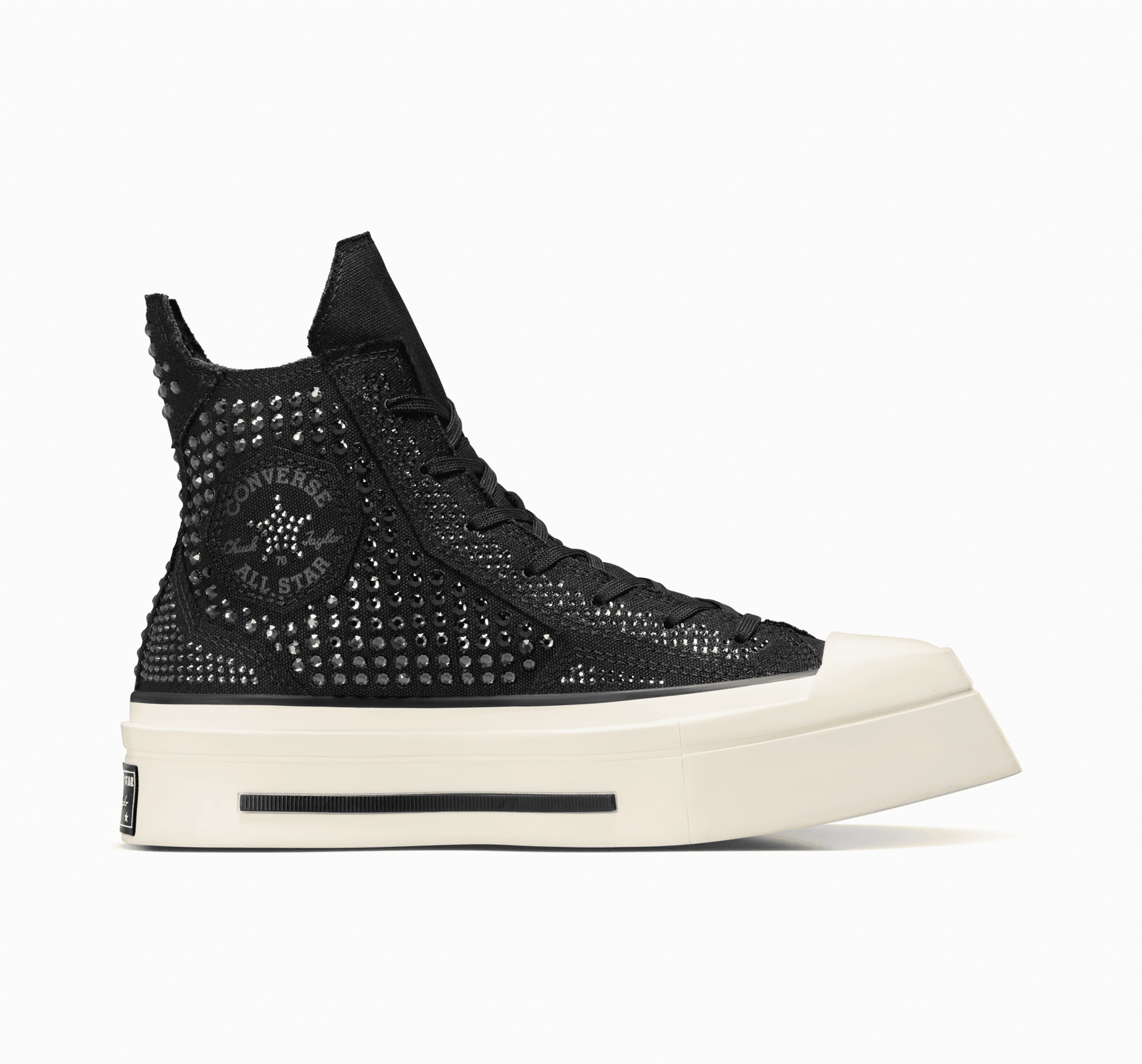 Vă prezentăm luxosul Converse De Luxe Squared cu cristale Swarovski®, o expresie unghiulară îndrăzneață a modelului premium Converse Chuck 70, împodobită cu peste o mie de cristale Swarovski®. Formele fațetate ale vârfului pătrat, ale ochelarilor și ale emblematicului patch Chuck Taylor All Star completează formele geometrice ale cristalelor Swarovski®.
