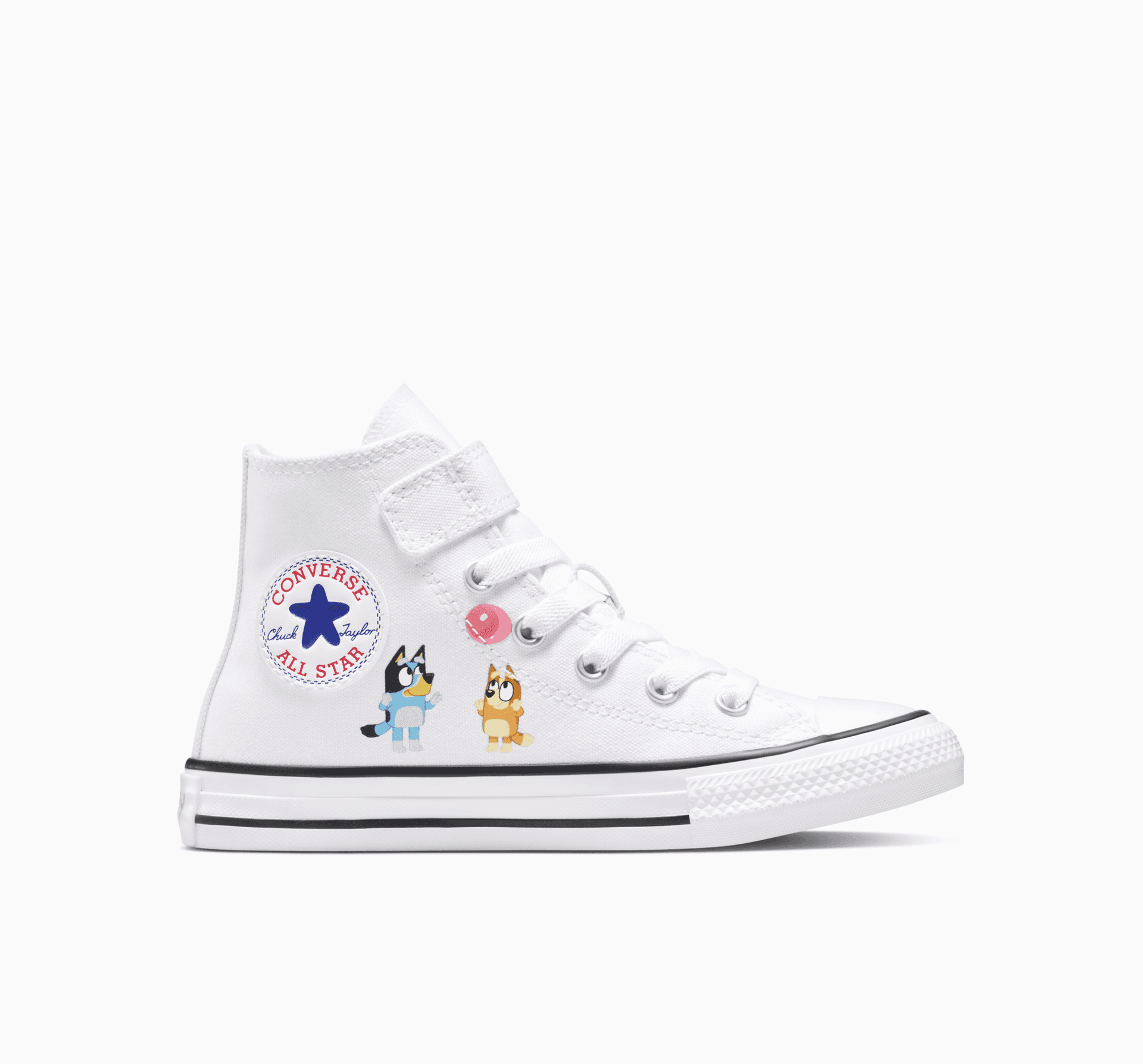 Wackadoo! Bluey apare în modelul clasic Chuck Taylor All Star pentru copii cu culori și grafică inspirate din serial. Designul combină elemente vizuale din episodul „Keepy Uppy” cu detalii emblematice Chuck, precum patch-ul embosat pe gleznă, dungile negre și o plăcuță de înmatriculare retro. Sărbătorește puterea atemporală a jocului creativ cu stilurile clasice Converse.