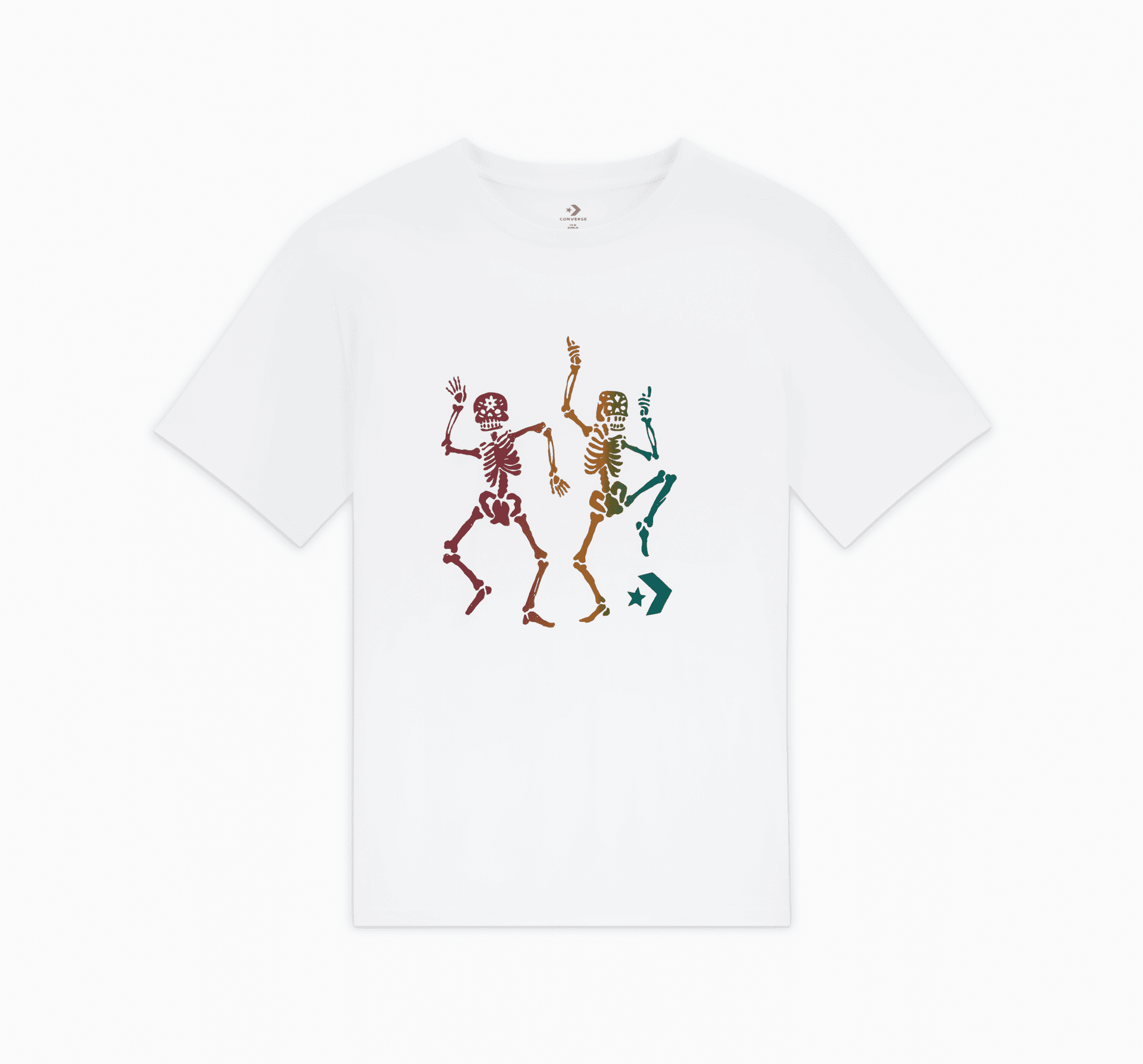 Tricou alb din bumbac cu schelete dansatoare în culori de sezon în