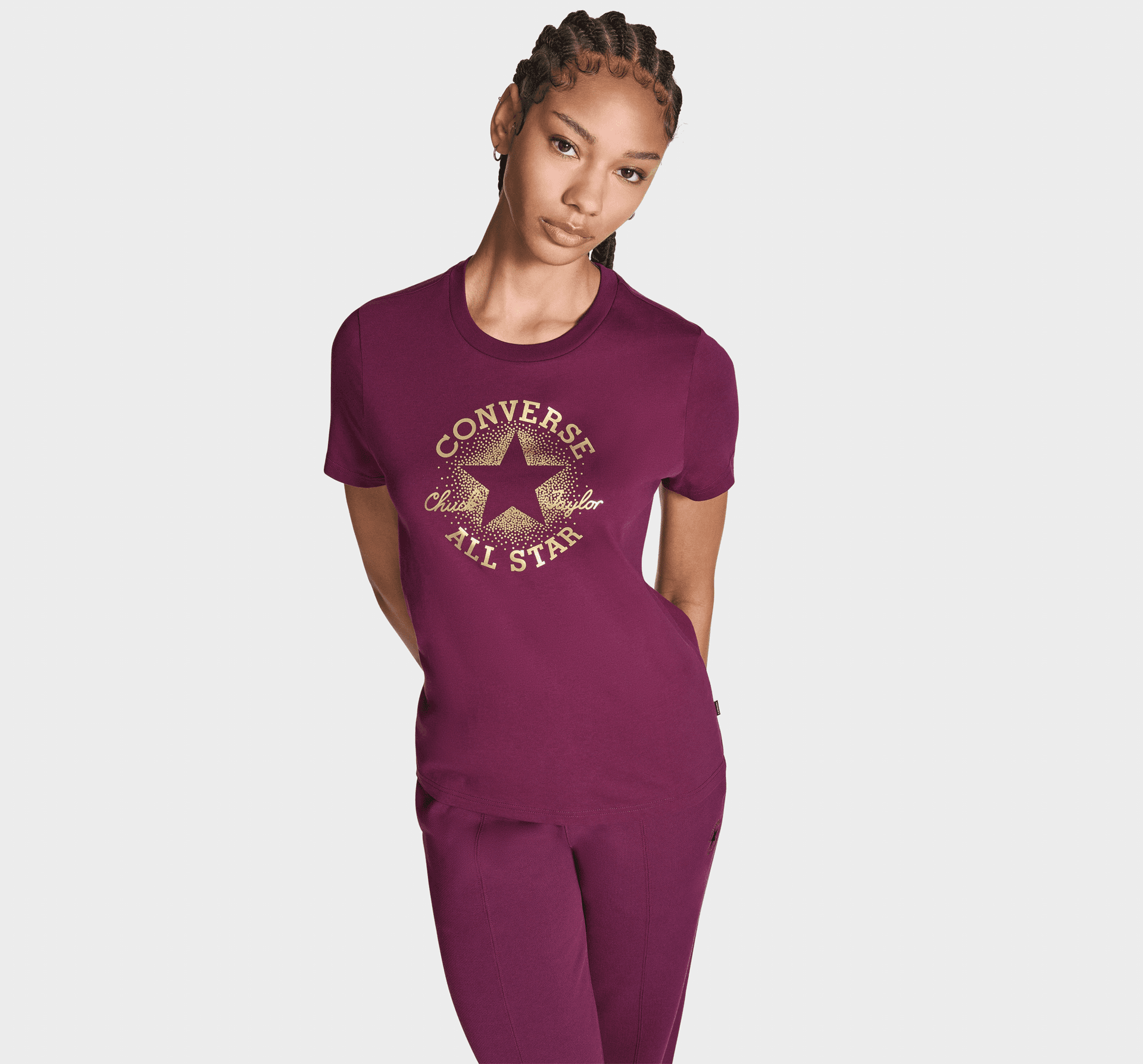 A metallic Chuck Taylor patch lights up the front of this clean-cut tee. Casual comfort with just the right amount of shine.