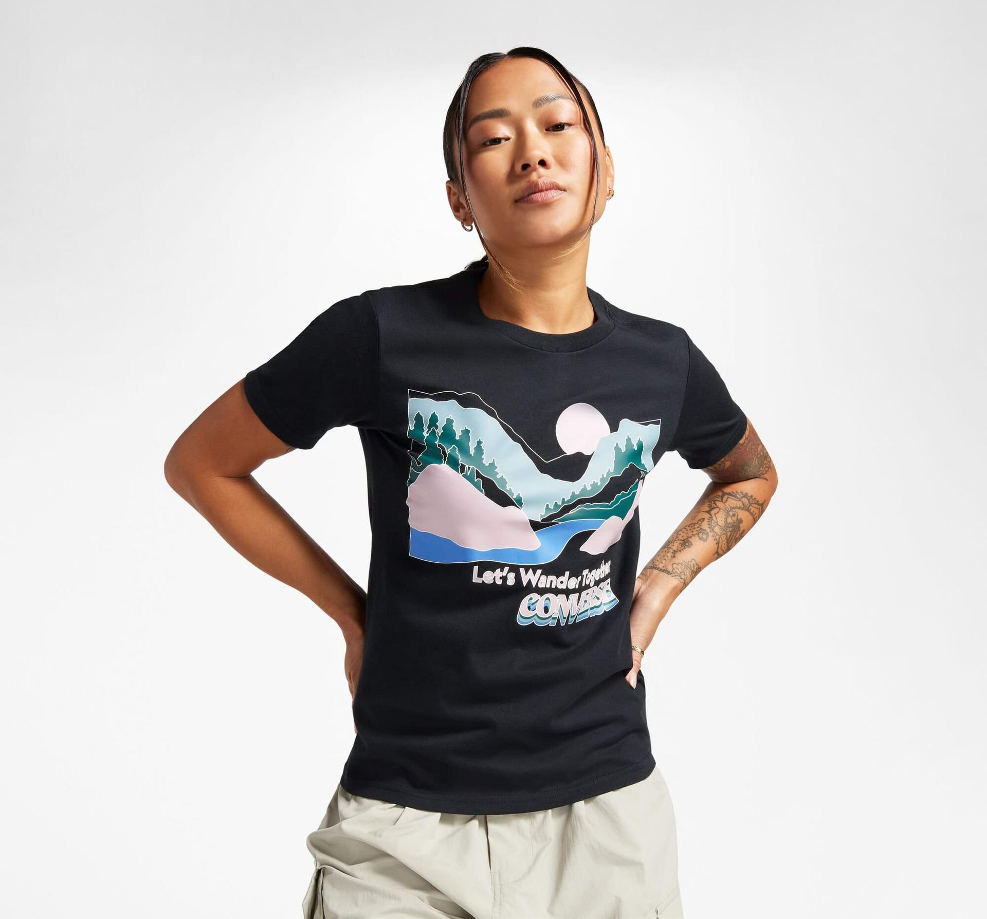 Grafică mare "Lets Wander Together" în partea din față a pieptului
